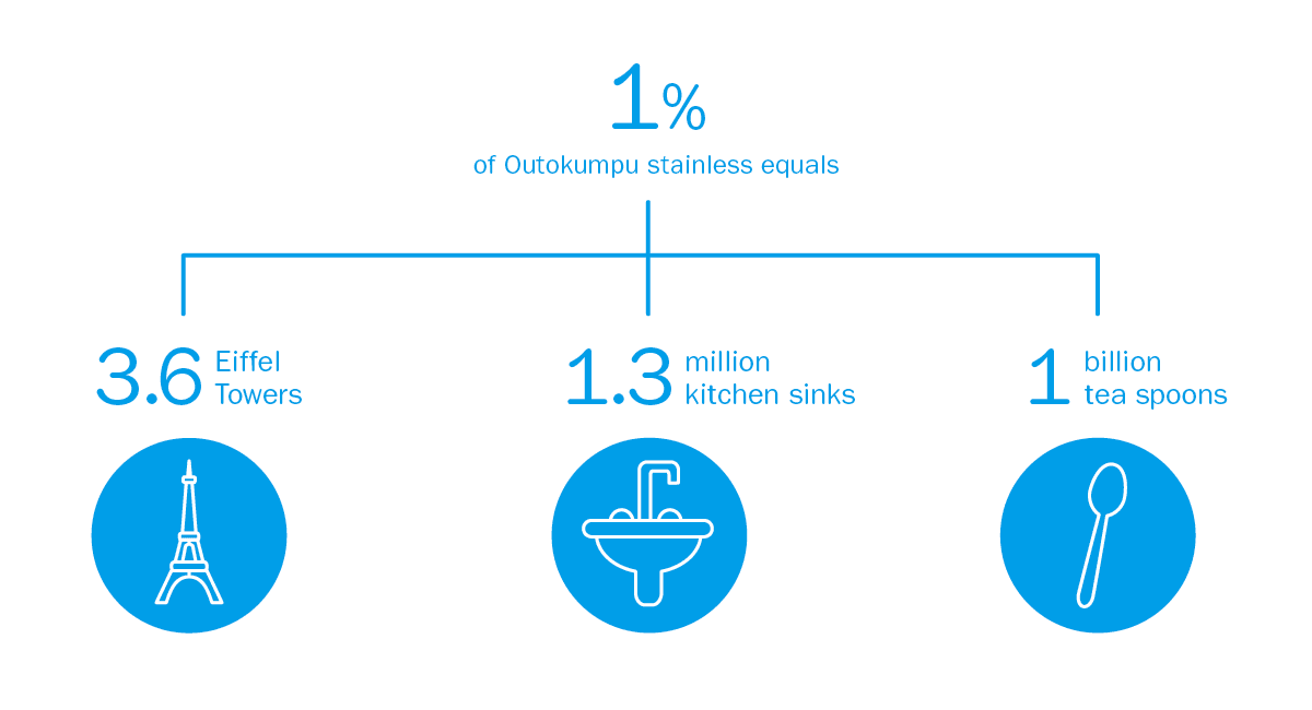 These numbers and their significance might be hard to grasp, but consider this. If Outokumpu increases the amount of recycled content by just one more per cent, from 87 to 88%, it would equal the metal used for: