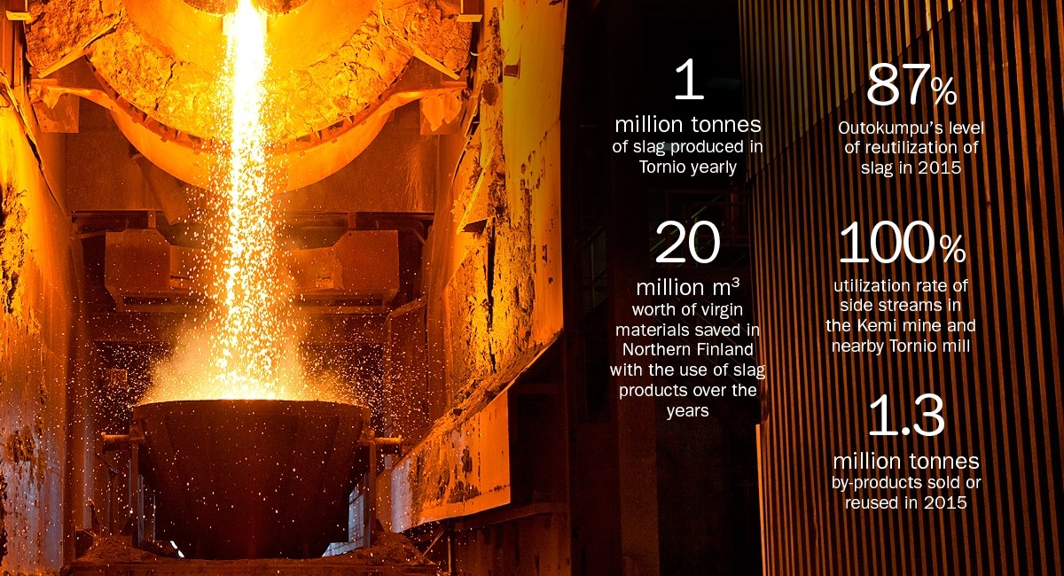 Outokumpu’s slag-based products have several standardized commercial uses, such as neutralisation in industrial processes and making refractory bricks for fireplaces. Most typically, however, they are used in road and building construction. “In fact, slag products have superior technical features for road bases. They are more durable and allow higher material efficiency,” Ylimaunu explains and stresses that this high level of optimization is a result of years of dedicated development work and improved plant processes. “We study all material streams from production in order to find means of fully reusing or selling them as products on the market. Last year, the Group sold or reused 1.3 million tonnes of by-products and the level of reutilization of slag was 87 percent,” Ylimaunu says. Outokumpu is the only stainless steel producer with its own ferrochrome plant. That enables the company to utilize atypical material flows compared to competitors. The Kemi mine and nearby Tornio mill are able to use a full 100% of side streams which are either sold to private companies and households or reutilized in Outokumpu’s own processes and construction projects.