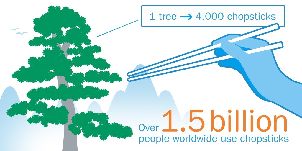 Everyday convenience aside, let us take a step back and look at the big picture. In 2013, China’s annual production of disposable wooden chopsticks was estimated to be 80 billion per year. According to the same estimation, 4,000 chopsticks can be carved from one 20-year old tree. This translates into 20 million trees per year.