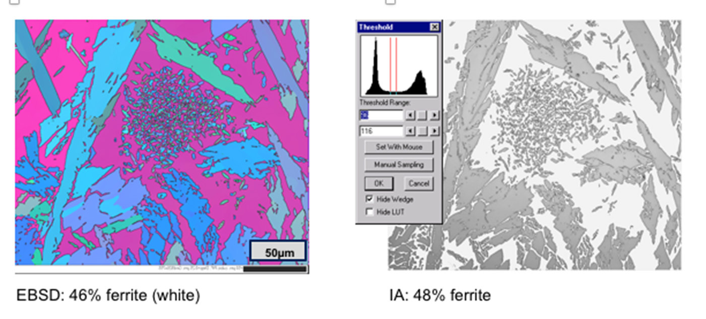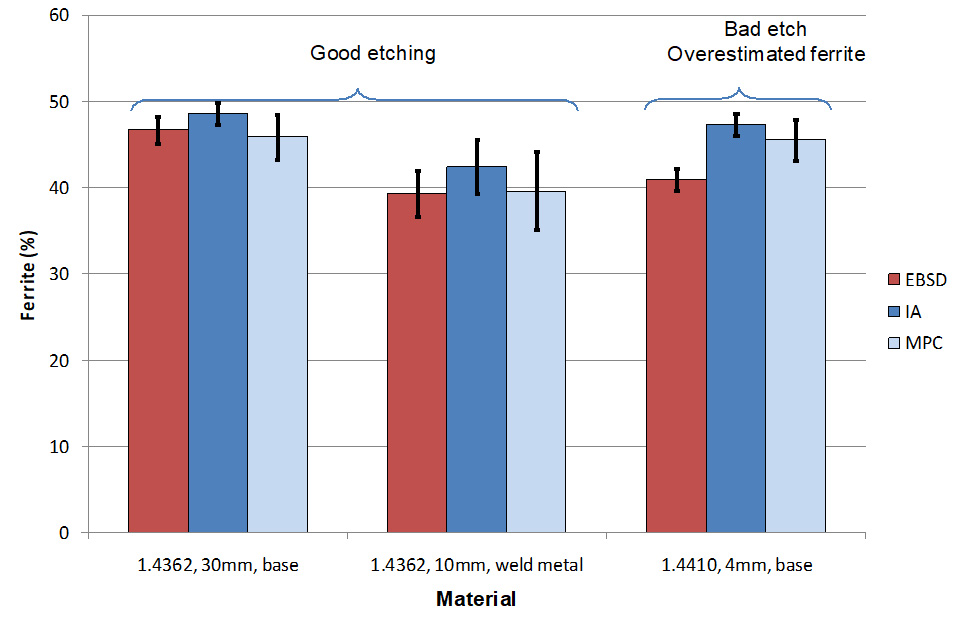 Figure 13 shows that there is generally a reasonable correlation between the results of EBSD, IA and MPC for good etching. However, bad etching will result in both IA and MPC over-estimating the ferrite content.