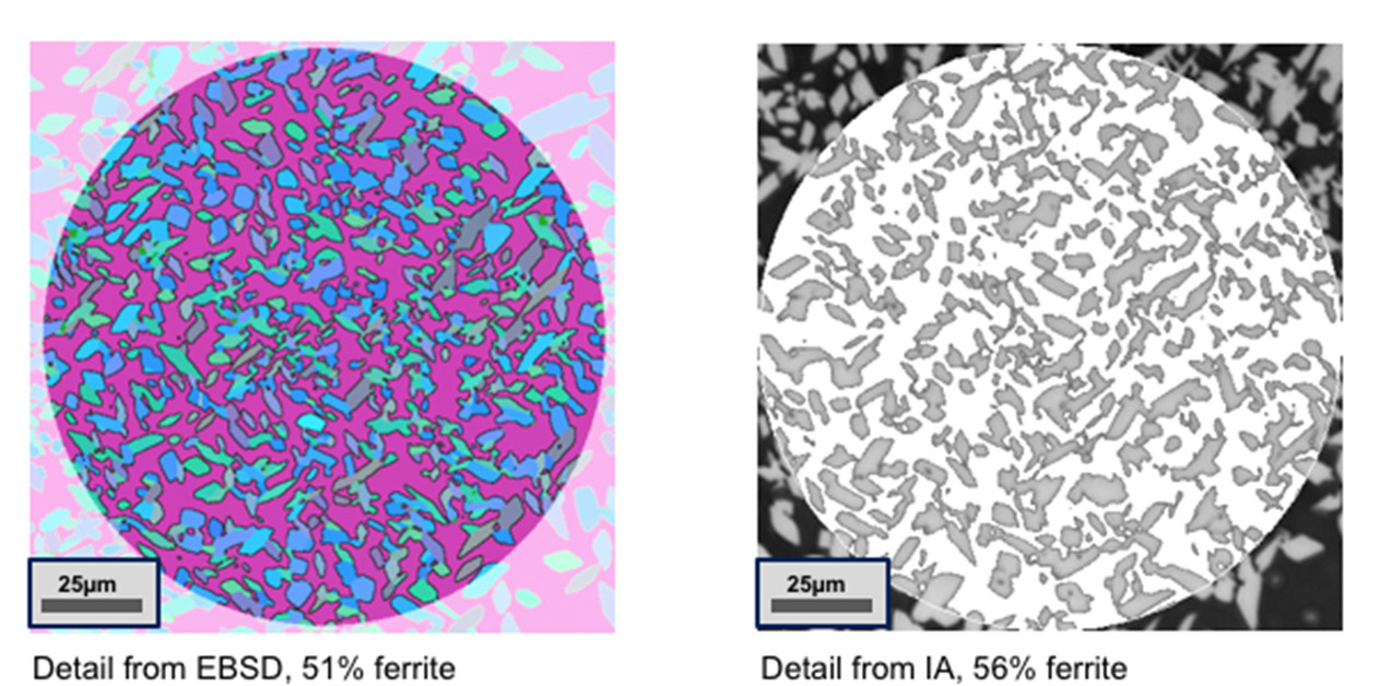 EBSD (electron backscatter diffraction) in an SEM (scanning electron microscope) is a useful reference technique for phase fraction measurement. One example is shown in Figure 10 where IA only over-estimates the ferrite content by 2% in a relatively tough structure with different structure sizes.
