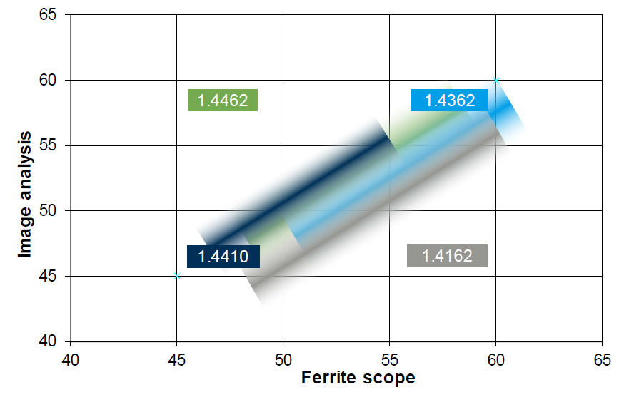 Figure 12 shows a comparison, for different materials, of the ferrite content measured by IA and Ferrite scope. In some cases the Ferrite scope produces an under-estimate, in others it over-estimates. Optimally it has been shown that a ferrite scope needs to be calibrated for alloy and product.