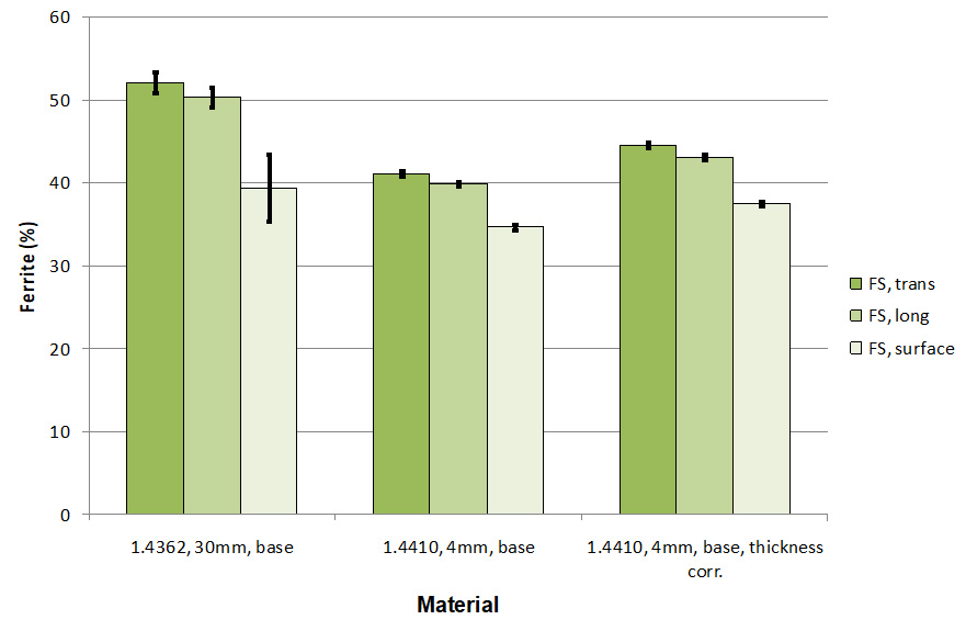In Figure 14 we see the significant variation in the reading produced by the Ferrite scope depending on the type of cross-section that is measured. While the second and third group of bar graphs show how the reading can be corrected for thickness.