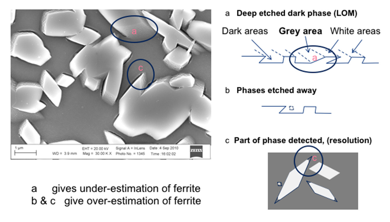 Deep etching of a sample can cause issues that result in either over- or under-estimation of the ferrite phase as illustrated in Figure 4.