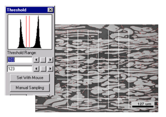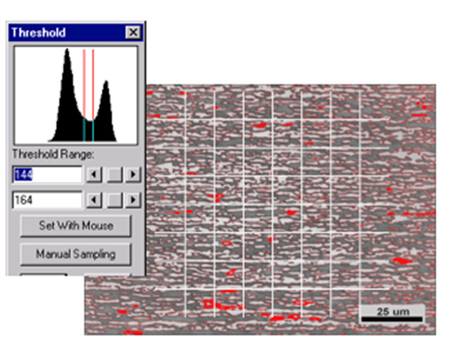 Image analysis uses computer software to analyse the microstructure on a pixel basis– see Figure 2. One can use either a manual or automatic set threshold and the method has the benefit of being fast. It is a good choice for most distributions and provides information on the overall distribution. Unlike MPC, IA is objective rather than subjective. But its success does rely on the quality of the etching.