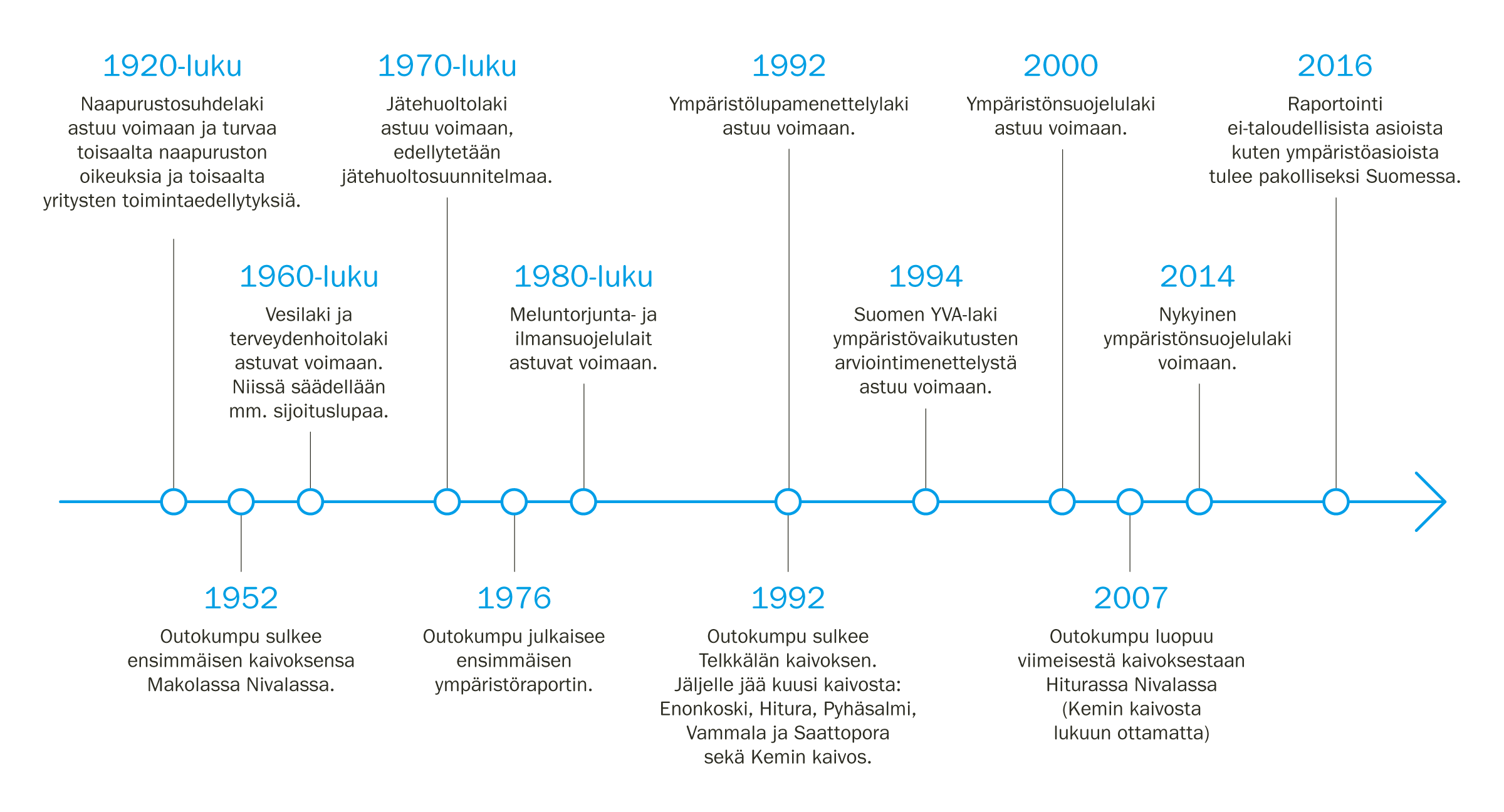 Suljettujen kaivosten turvallisuus- ja ympäristövastuut perustuvat viranomaisten aikoinaan tekemiin lupiin ja päätökseen, jotka on tehty silloin voimassa olleen lainsäädännön mukaisesti. Vanhat luvat eivät ole monelta osin vertailukelpoisia nykylainsäädännön kanssa, sillä ympäristömääräykset ovat kehittyneet valtavasti erityisesti viimeisten vuosikymmenten aikana. Kaivokset, joihin liittyviä vastuita Outokummulla yhä on, ovat toimineet pääasiassa 1950–1980-luvuilla eli aikana ennen nykymuotoista ympäristösääntelyä.