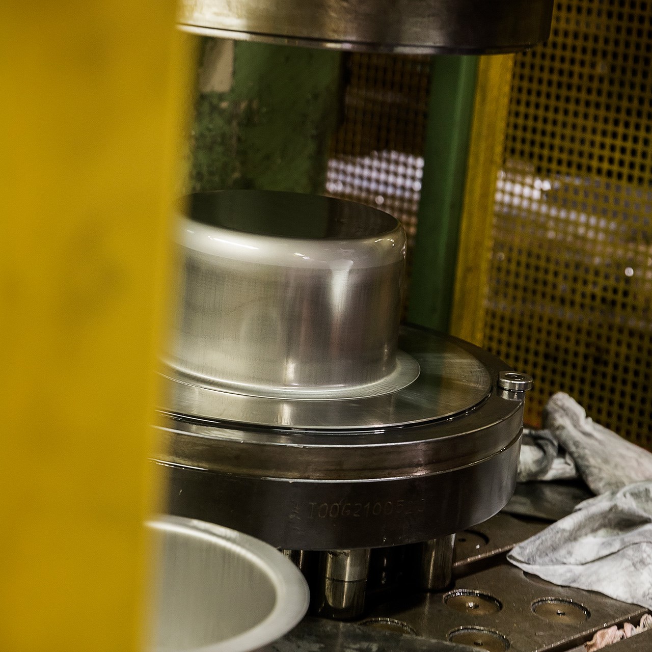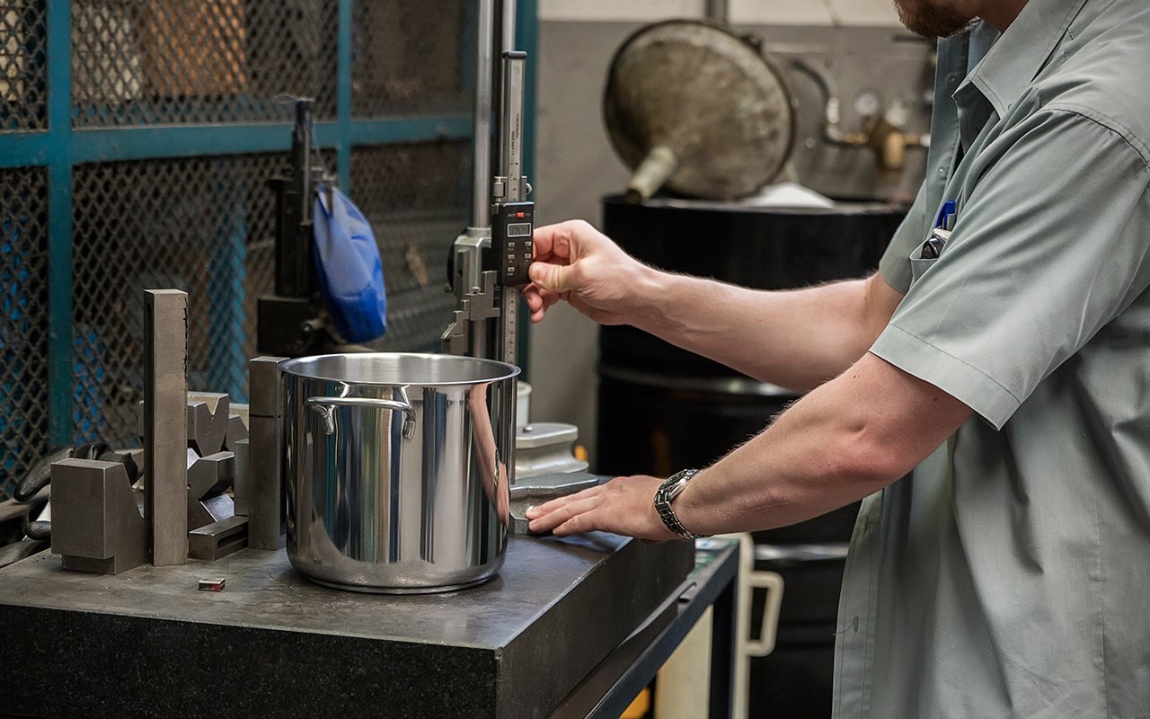 The disc is leaning on this ring, sustained by a column that hides the fixed punch. The die falls from above and the stainless disc is forced to stick to it by the punch. This is the first deep drawing: its result is a 24 cm diameter pan. Now we need a second deep drawing action; the pan is placed on a smaller die, re-punched and literally turned inside out like a sock. The diameter is 20 cm, but the pot is taller. The deep drawing operations are instantaneous. Punch pressure makes stainless steel look like melted wax. The pot is stamped. Borghetti visually inspects the surface: he looks pleased. No evident roping.