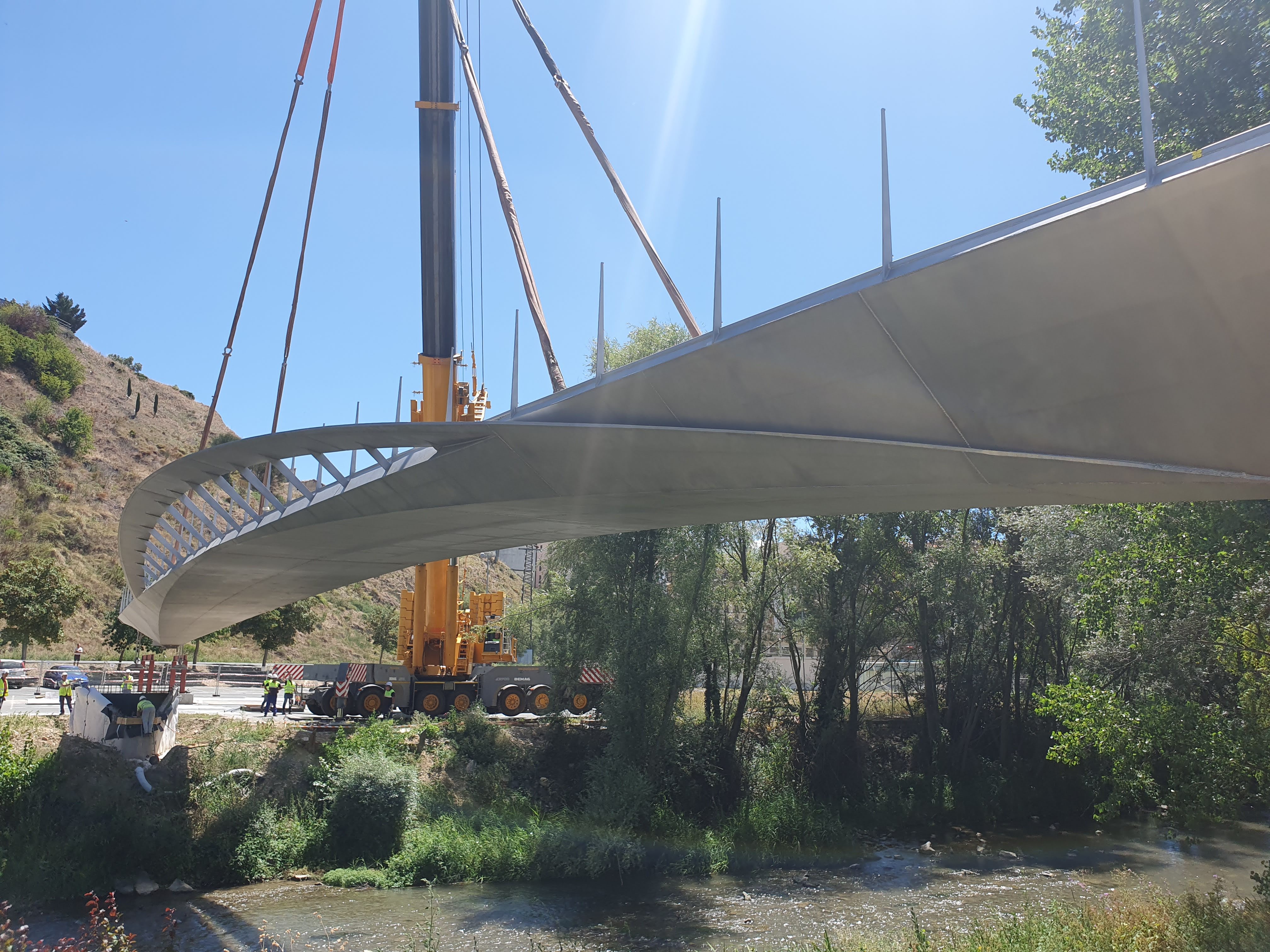 In parallel, construction firm Orion prepared the site on the Tirón River. This included major groundworks to build the concrete abutments and to reinforce the riverbank to support the weight of the 700 ton capacity crane needed to lift the bridge into position.
