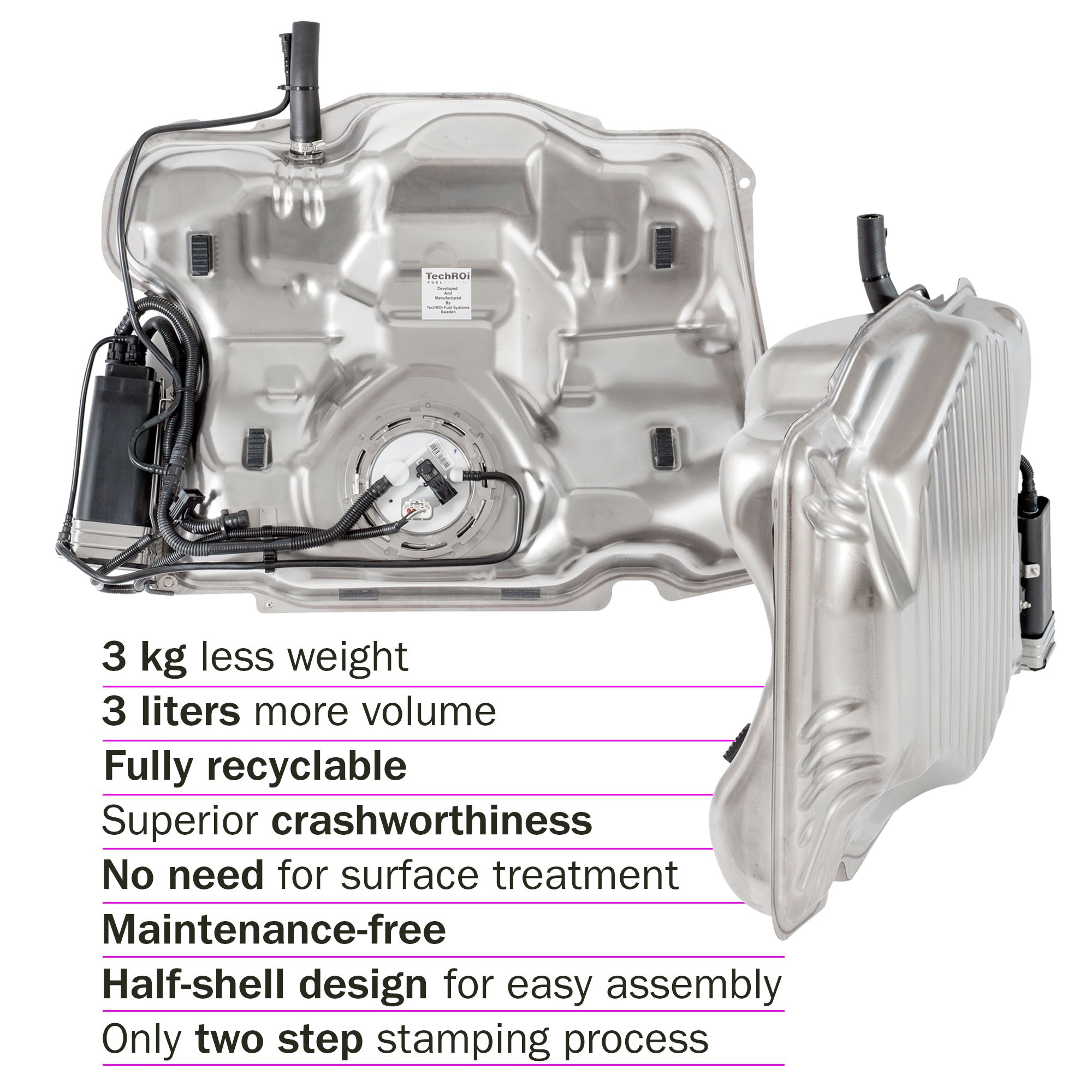It weighs almost half of its plastic alternative, gains three liters of volume, and provides serious advantages to its crashworthiness. And the tank is fully recyclable.